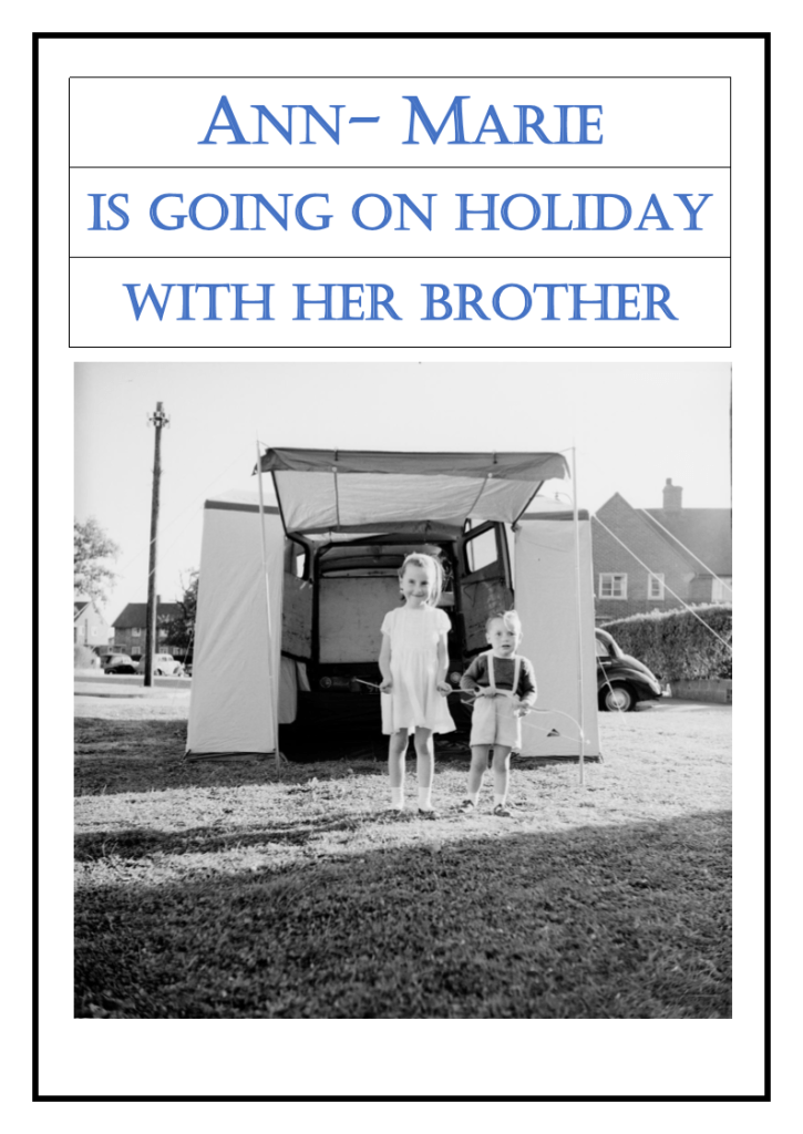 Ready to go on an adventure from a very young age!!Our Dormobile van – Registration JMT 918 – extending roof and internal fit out built by our Dad. I slept by the top windows, JW slept halfway down and Mum and Dad at seat level. The tent was orange with a dark blue roof so, as Dad said, it was always sunny inside. Happy, happy times.Practicing putting up our new tent on the grass outside our house. It had a double-opening so the Dormobile could reverse in and make two joined up ‘rooms’.Driving a tractor at the Hertfordshire County Show.Swanage – of course! My red nylon, bubbly, ever-extending swimming costume.Swanage – I well remember that pretty frock!