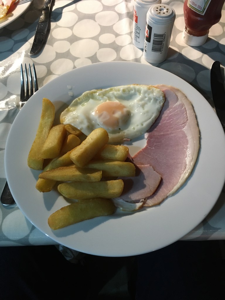 After circling the site twice(!) we chose a pitch and got set up – it’s one night, but choice of pitch is important! As a treat, we had JW’s favourite meal – ham, egg & chips – in this case butcher’s ham and M&S fat chips, which were yummy! Followed by ‘cookie’ (sponge pudding) and custard.