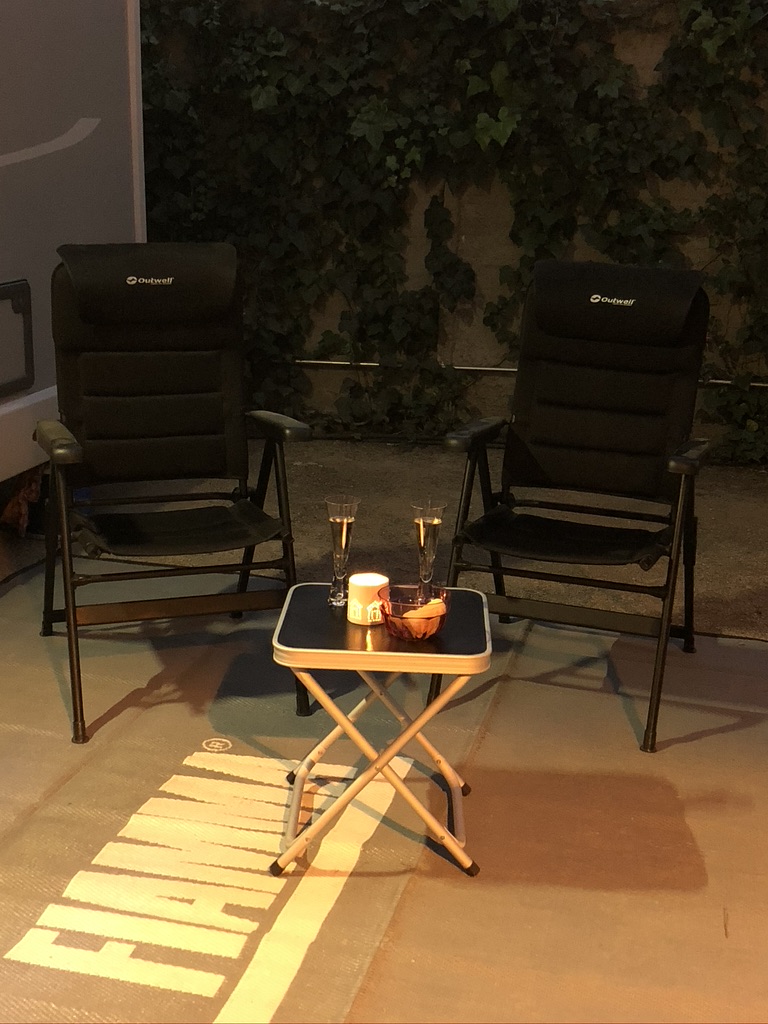 So it’s JW’s last evening with me – I think he’s had a nice time. I certainly have. He even agrees to drinks outside, so a small Prosecco and dinner in the motorhome.