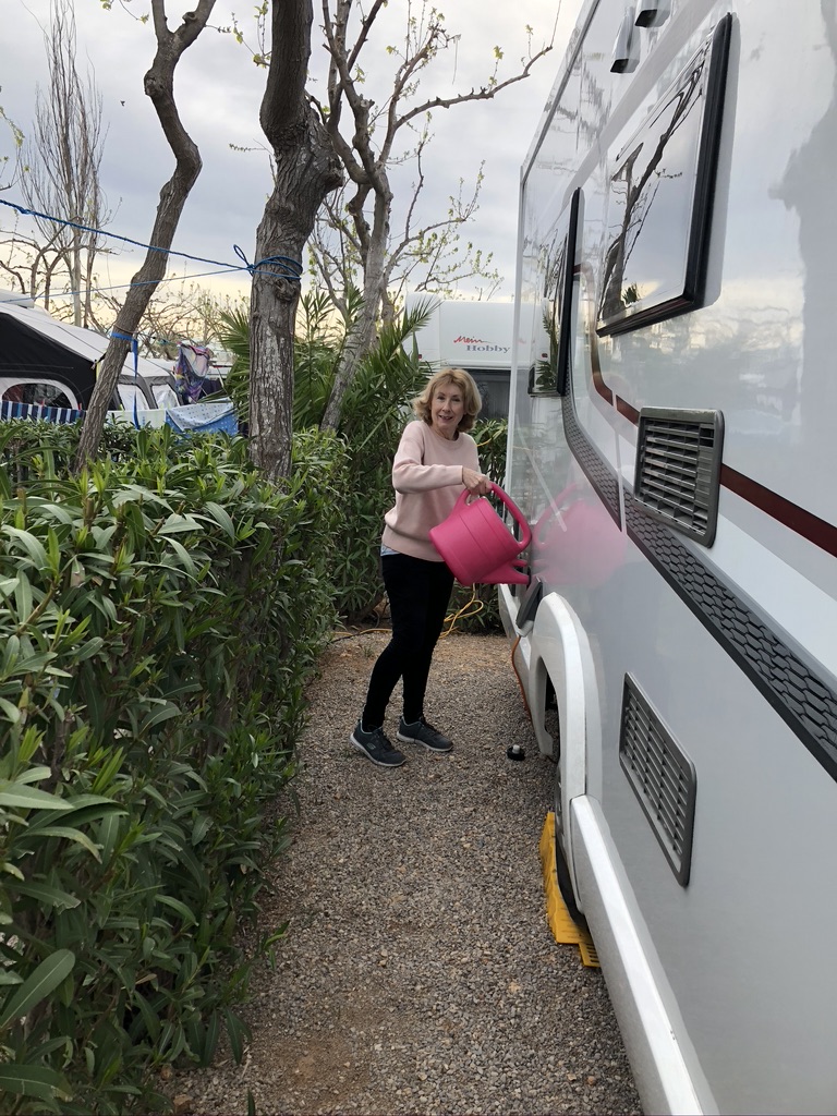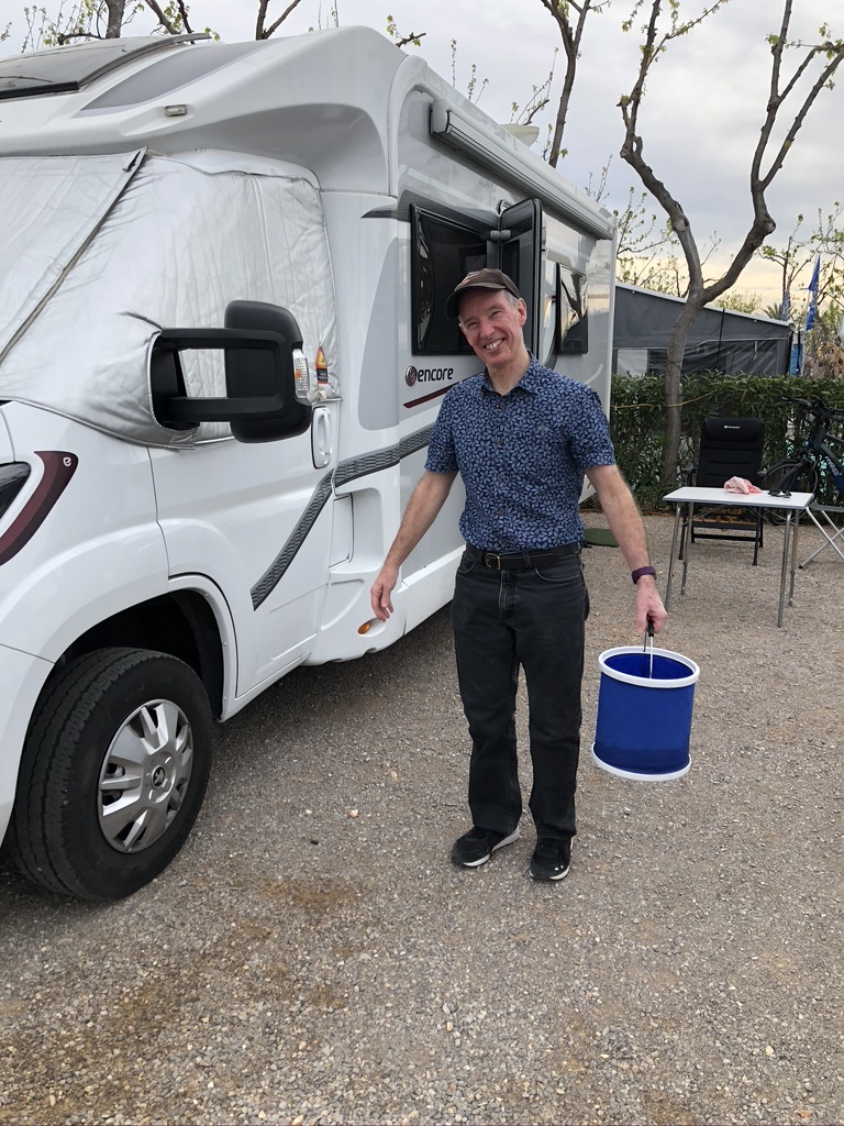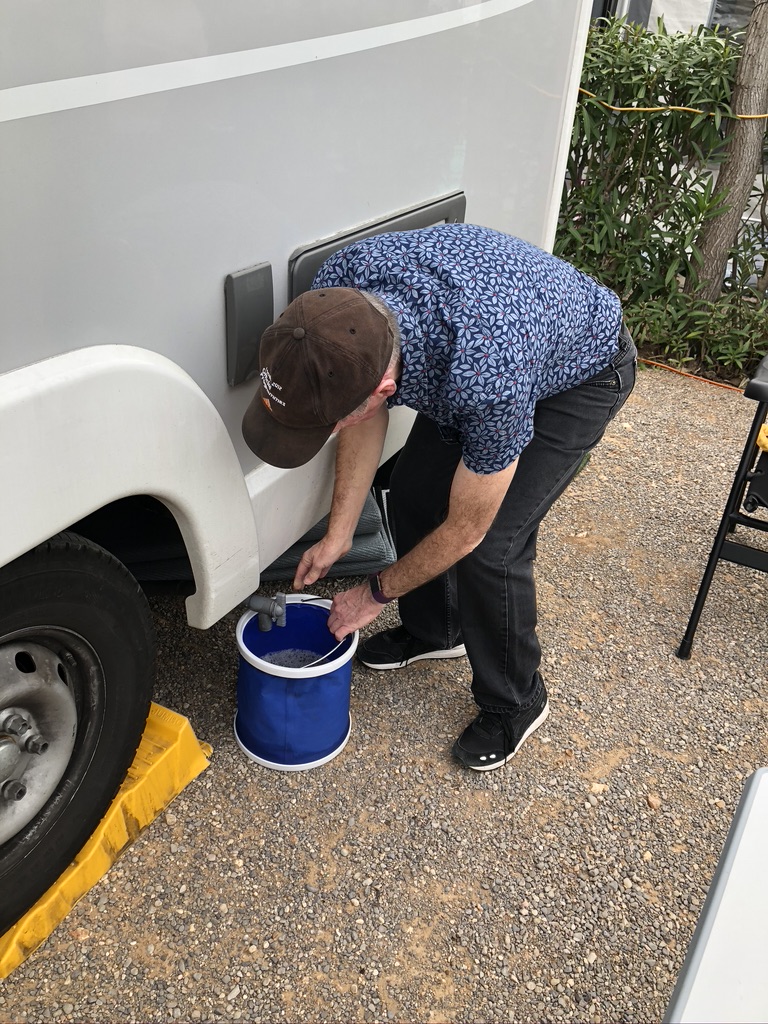 It’s an hour and a half’s ride, but we have a bit of time so everyone helps out with motorhome duties. Nigel’s job is to watch the grey waste evacuating and make sure the bucket doesn’t over-flow …………. “Nigel, are you watching that bucket?!” Uh oh!