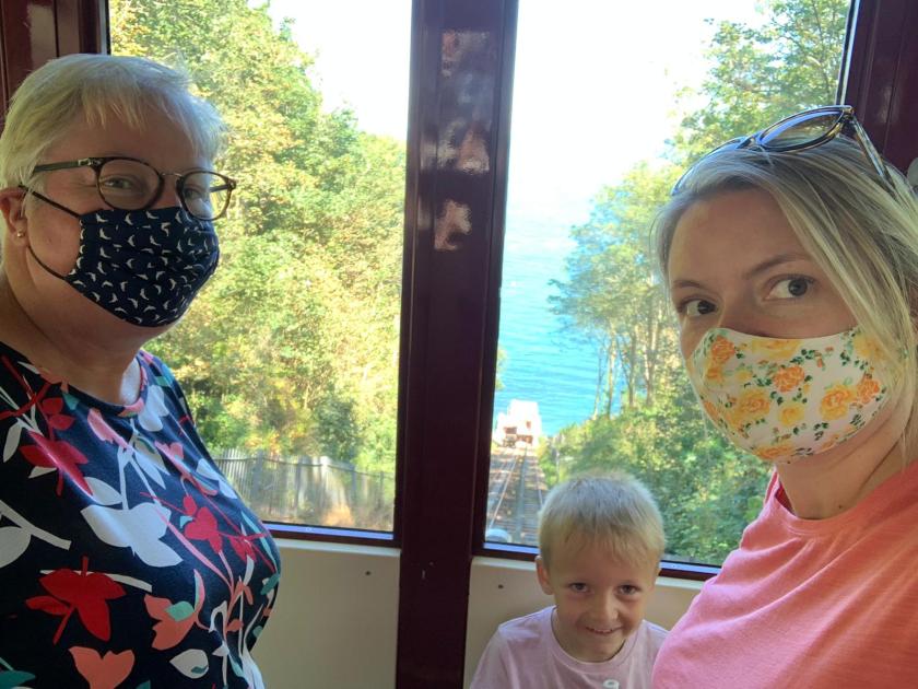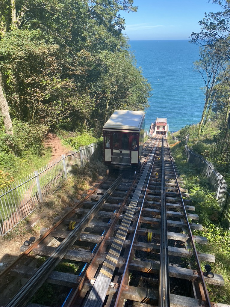 After lunch at The Cliff Railway Café at Babbacombe, which magically appeared out of nowhere and was exactly what we needed, we decided to go down on the cliff railway to Oddicombe Beach and back up again, just for the ride. The lady in the ticket office did mention watching the queues on the way back up; we didn’t really listen. So we got down there, Ted bought a second pirate set, we took a photo or two and then queued for half an hour to get back up again – doh!