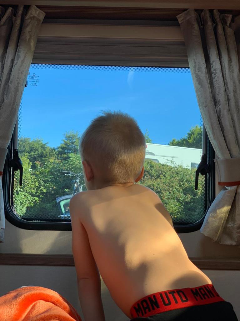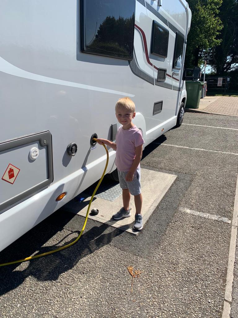 It is agreed that Ted will ride in the passenger seat of the motorhome for the last 45 minutes of our journey. We begin to move his car seat over when there is a moment of horror – while we are distracted, Ted is playing hide and seek outside behind the motorhome in the lorry park and not inside the motorhome toilet as I had thought!! 😱 After a small discussion about safety, we set off to The Caravan & Motorhome Club Site at Hillhead, near Brixham.