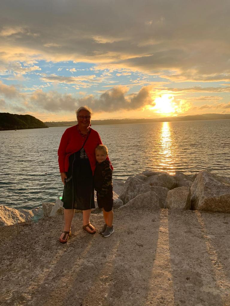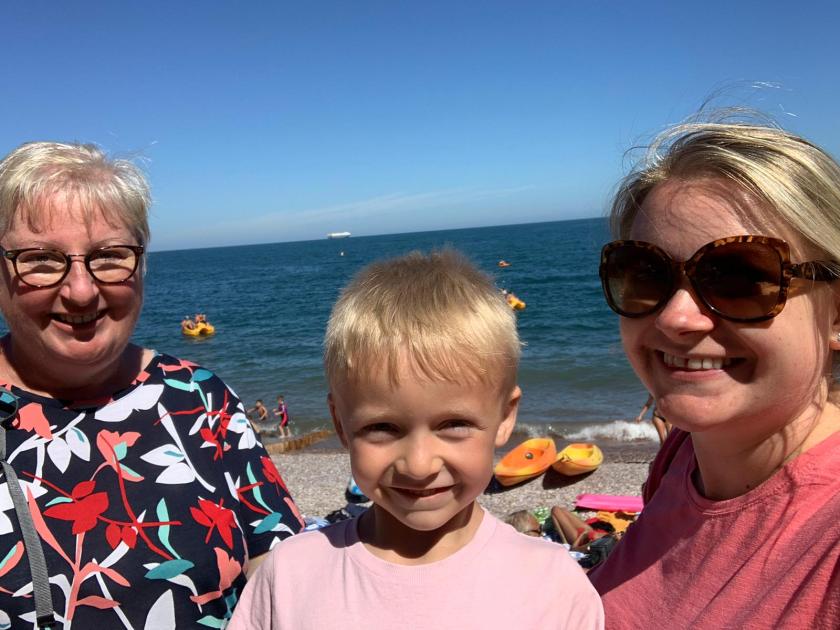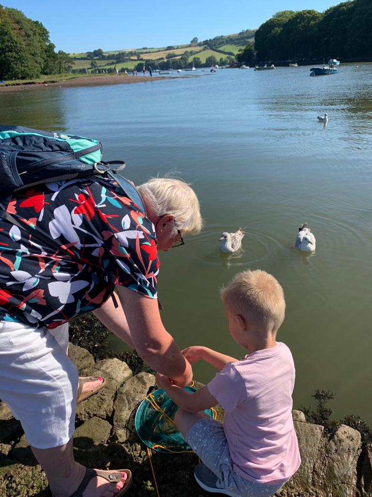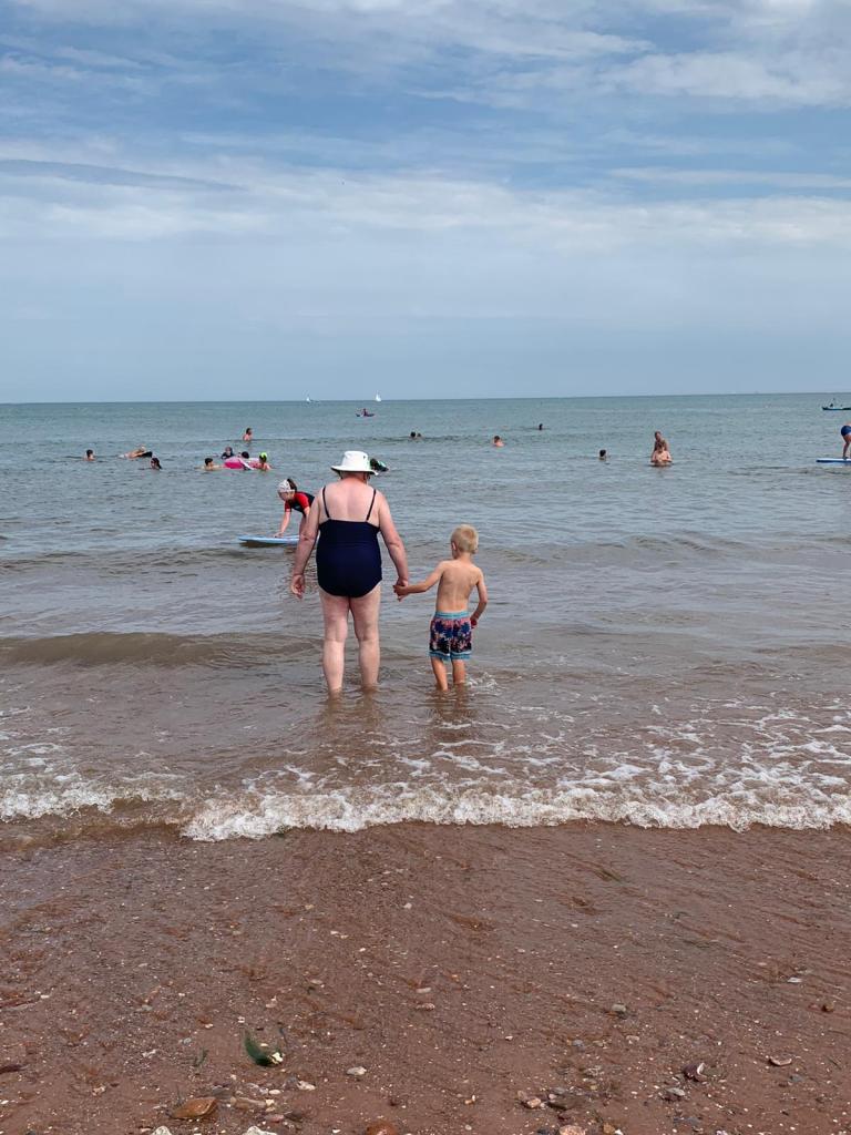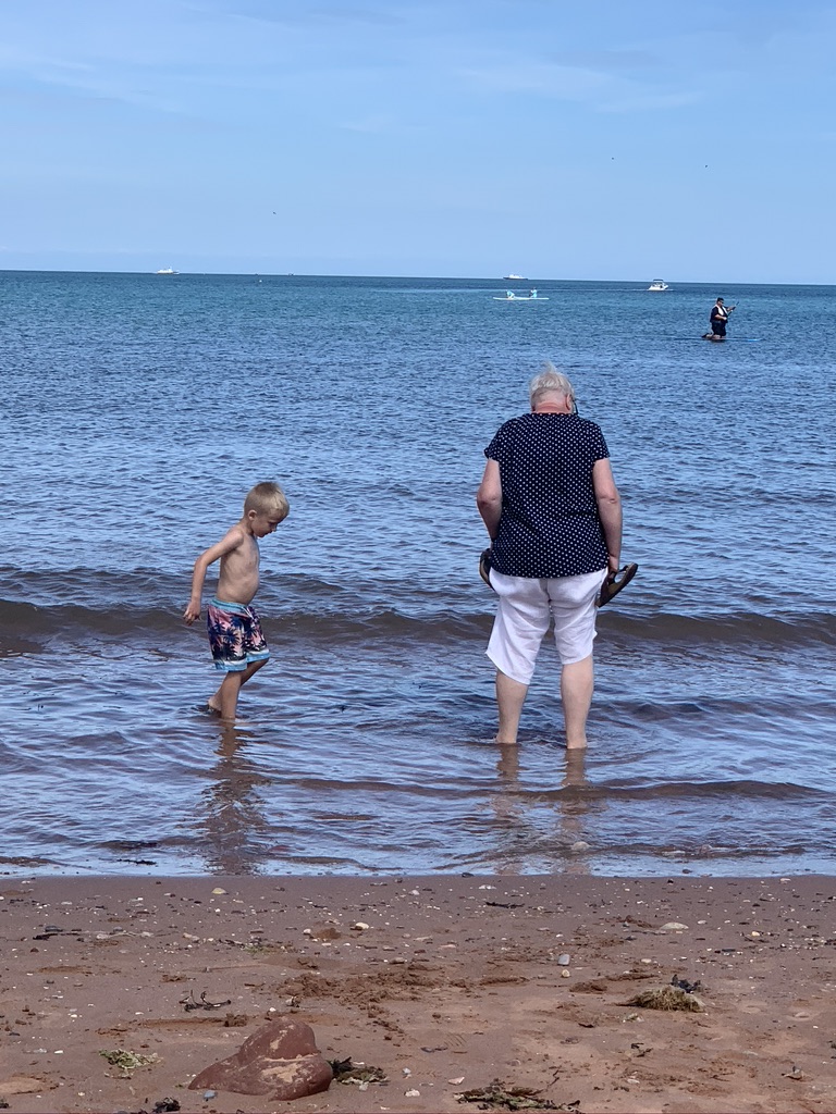 We made a packed lunch and set off for our first visit to the beach – looking for the best option we tried Broadsands, then the south end of Goodrington Sands then the main part of Goodrington Sands, where I had taken Jamie and Emily when they were small. It was a bit of a walk from the car park carrying the windbreak, chairs, towels, bucket, spade, lunch etc. On our return we used the drop off point, much better. Lovely sunny day, Ted was in his element. We spent some time learning to skim stones and he spotted a jellyfish! The trains on the Dartmouth Steam Railway run along at the back of the beach offering a waving opportunity every 30 mins or so.