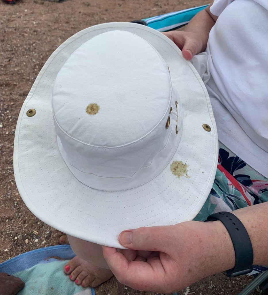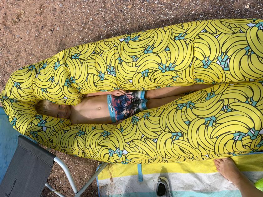 I attempted to fill the ‘Banana Bed’ thingy with air. After spinning round many times and making myself quite dizzy I think I can safely say I do not have the requisite skill-set to get sufficient air inside the bag to create a bed or even a chair!! Ted tested it out and almost totally disappeared from sight! Exhausted I sat on my brand new £10 beach chair wearing my Tilley hat and was immediately dive-bombed by a large seagull who left a spattering of poop all over my hat, my clothes and my new beach chair!!