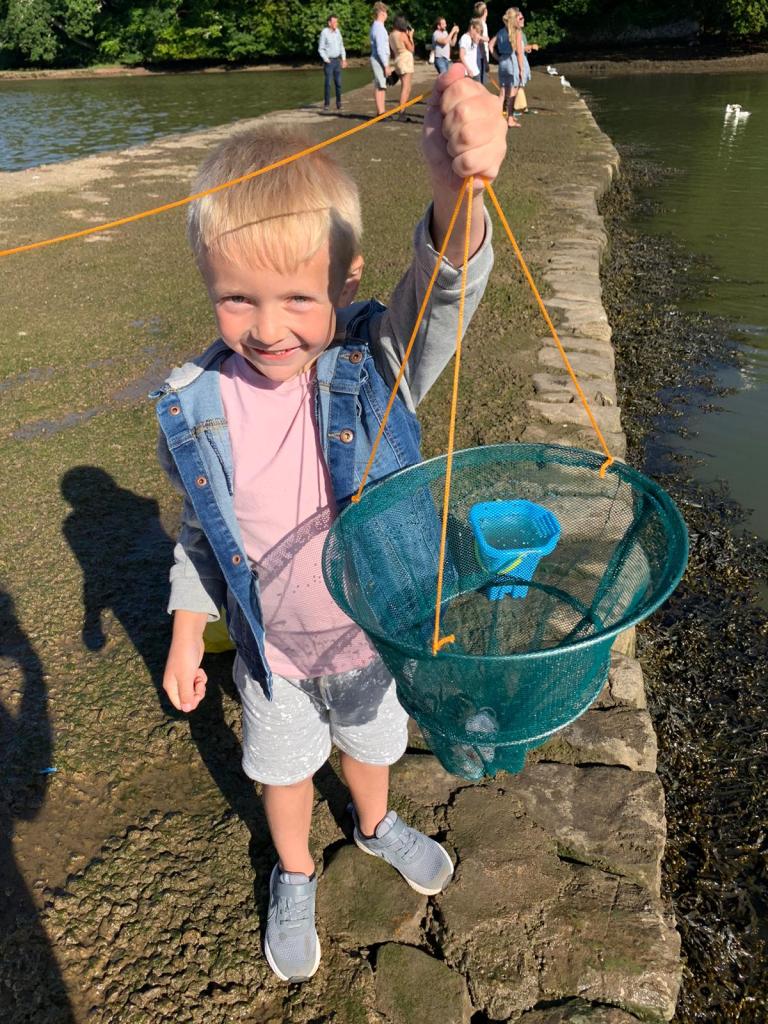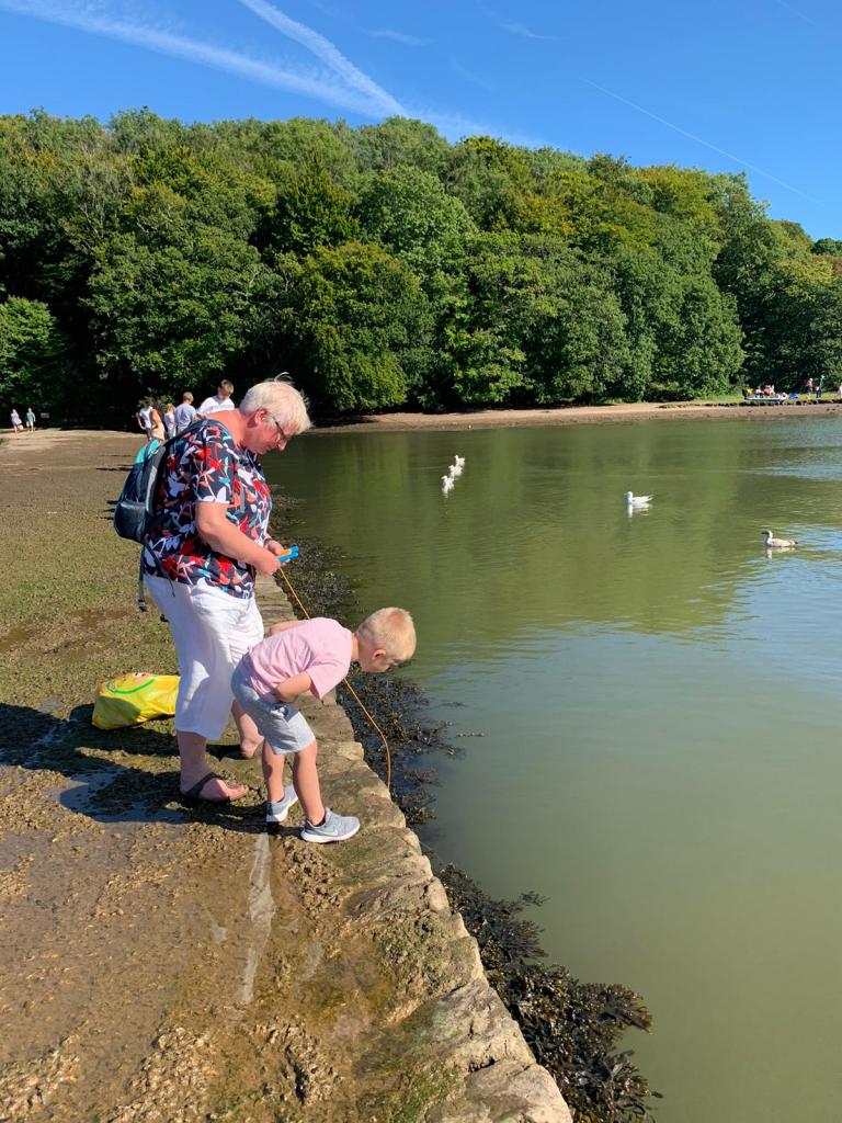 On the way back to the site we went to the village of Stoke Gabriel, which is famous for crabbing. I had also taken Jamie and Emily there years back. We arrived at 4.50 p.m. and the very nice car park man said we could park for free – £5 saved!! We set up and, with helpful advice from some fellow-crabbers, Ted was soon hauling them in. I think he got about 15 or so in total. One climbed out of the bucket and threw itself back into the water, another fell into a crack in the pavement as we tried to return him – we couldn’t get him out so left him for a bit. He’d obviously used this trick before as, once the coast was clear, he levered himself out of the crack, looked both ways and made it straight back into the water – how does a crab know which way it is to the water?!