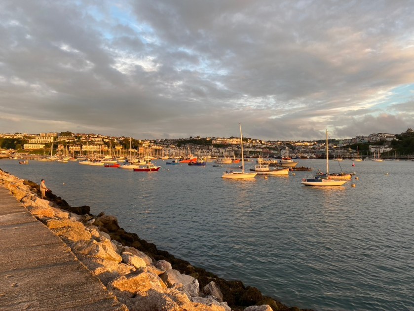 We had planned to eat out on our last night but our first choice, Rockfish, had not yet opened after the lockdown. Our second chosen venue, The Prince William gastro pub in Brixham, – https://theprincewilliam.co.uk – was full inside and you just had to take pot-luck with the outside tables. We turned up and were told we could sit and have drinks and wait for one of the 8 outdoor tables on which they were serving food to become free. We sat for a bit and then thought we should start searching for somewhere else, but the kindly waitress bumped us up the line and gave us a table. The subsequent rain did not diminish the lovely lemon sole I had at all – yum!