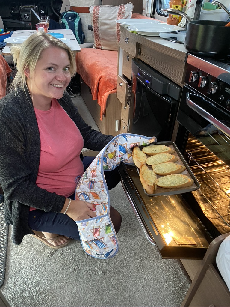 Packed for our journeys, we both left the pitch and drove up to the motorhome waste point to empty the loo. Em and Teddy went off to the toilet block but returned very quickly as it was being cleaned. Their unexpected quick return could have been an expensive mistake. As they arrived, I simply swivelled round in my chair and drove off, not realising I’d left the habitation door wide open. On the one way system on site we had to drive down a very, very, very steep hill with high grass embankments on either side. As the motorhome went down the door must have swung open and embedded itself in the grassy bank. Fortunately Em saw what was happening and stopped me from going further. A kindly gentleman helped me, the surprised driver (who didn’t even get up from her seat to see what the situation was!) by telling her which way to turn the steering wheel to release the door. It needed a lot of ‘revs’ to reverse those few inches, alerting half the site to my stupidity. There was also a moment when I realised Em, now very pregnant, was climbing the huge grass banking to get a better view!! 😱 Initially, there didn’t seem to be any damage – it could easily have ripped the door right off – but I later found three little marks on the inner side of the door to remind me of my mistake!