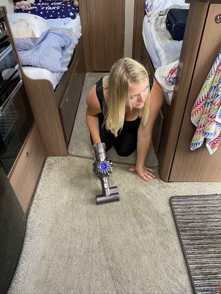 A bit of unpacking and organisation; Em – now 17 weeks pregnant – gamely on hands and knees vacuuming the carpet to clear up some bits and bobs possibly left from Spain!
