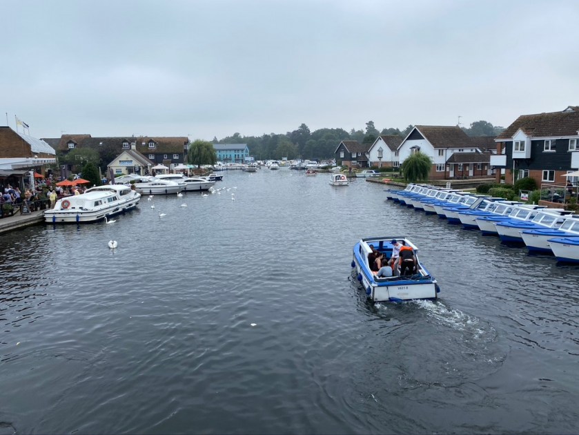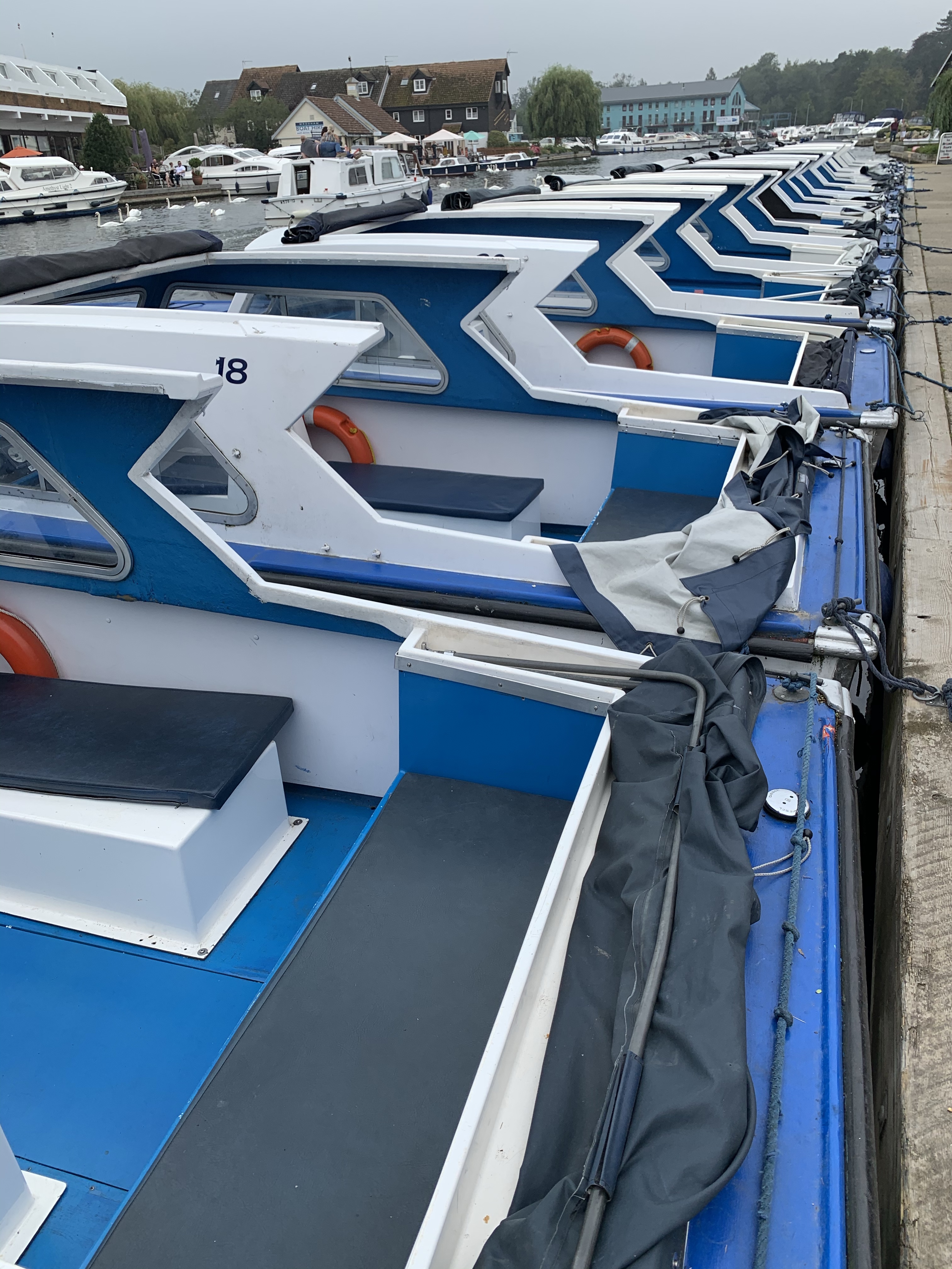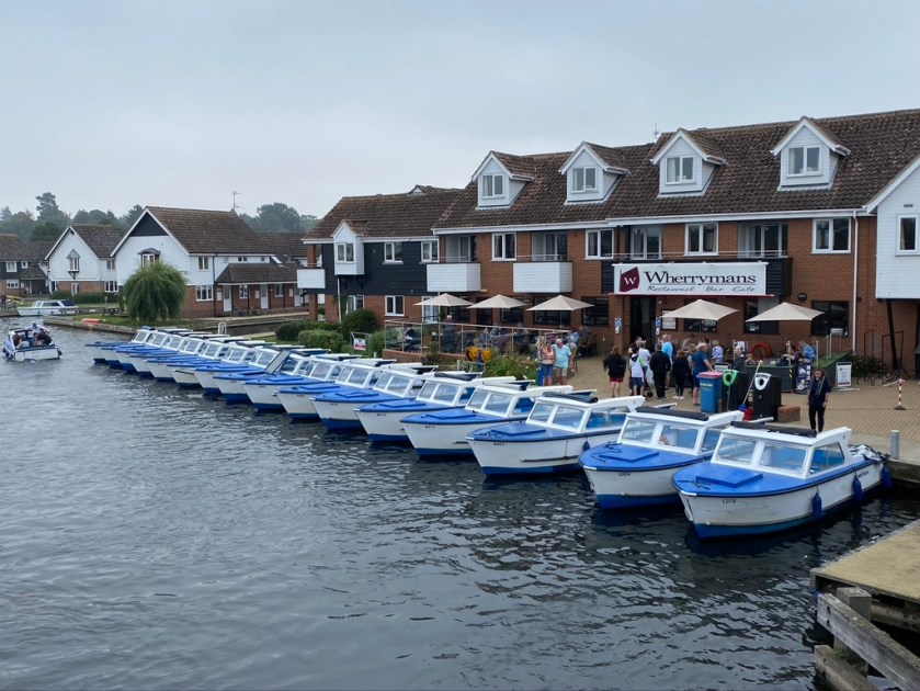 Two parties set off in another haar, one for Crazy Golf in Great Yarmouth and one to Wroxham ‘capital of The Broads’. A return visit for us for tea and cake at the The Wherrymans http://www.wherrymans.co.uk by the bridge in Wroxham. The boat hire next door was open; it must just’ve been a 1.00 p.m. return time forming a pleasingly smart line up.