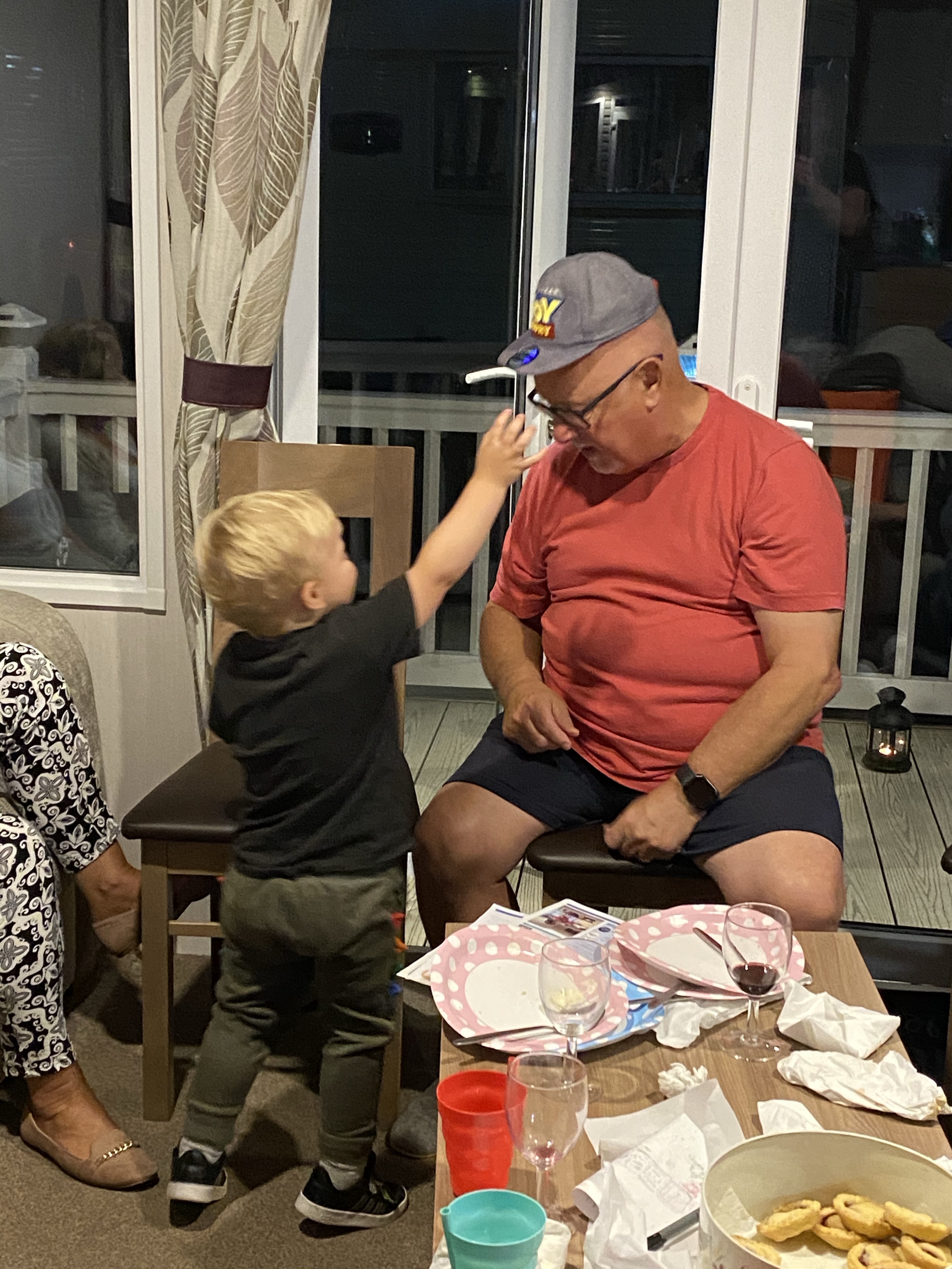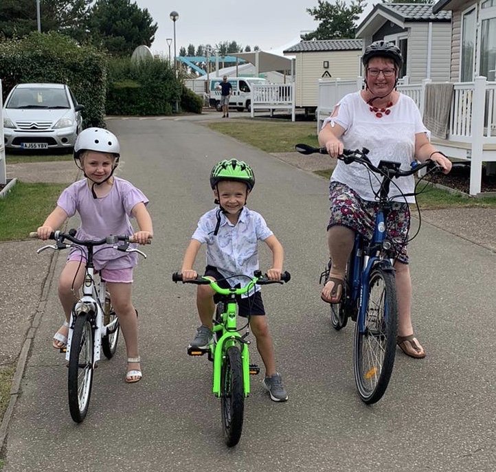 Back at the site for tea on the decking and then Evie, Teddy and Grauntie Ann rode around the block and to the beach on bikes; Evie and Teddy able to ride for the first time together on two wheels now that he has mastered it fully.