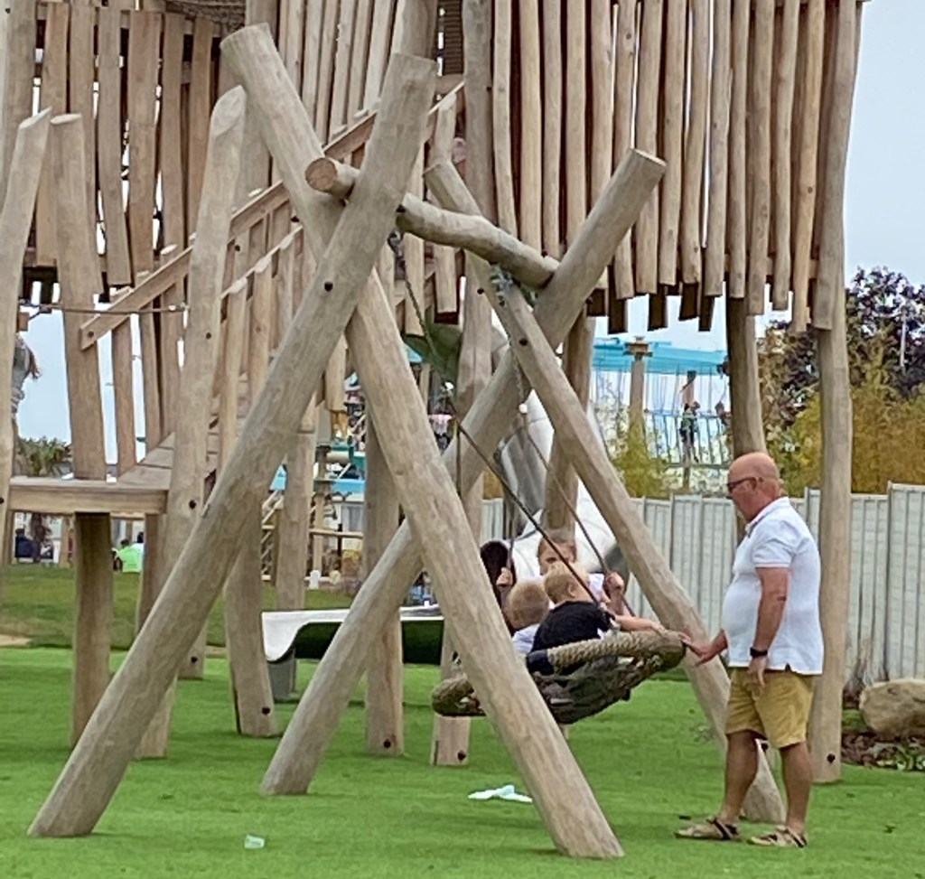 Sensibly it was decided to have lunch back at the site ….. creating the upside of sand-free sandwiches! We ate at tables in one of the central areas so the kids could play in the playground afterwards. At one point it was discovered that Husband was suddenly in sole charge of all three children. It is well known that Husband is really not keen on children so, of course, they are completely attracted to him!! “Fester, Fester, Fester!!” 😱🤣