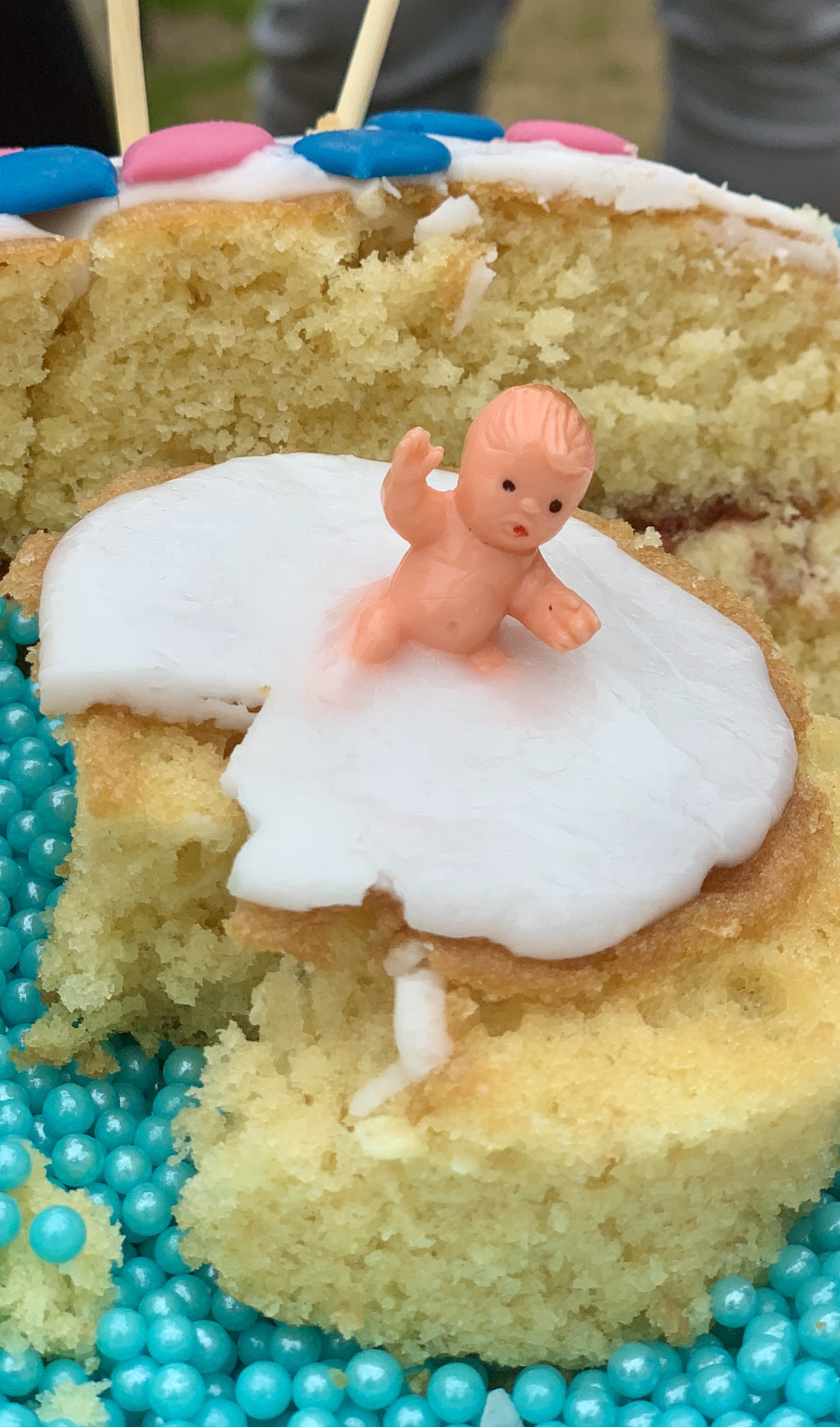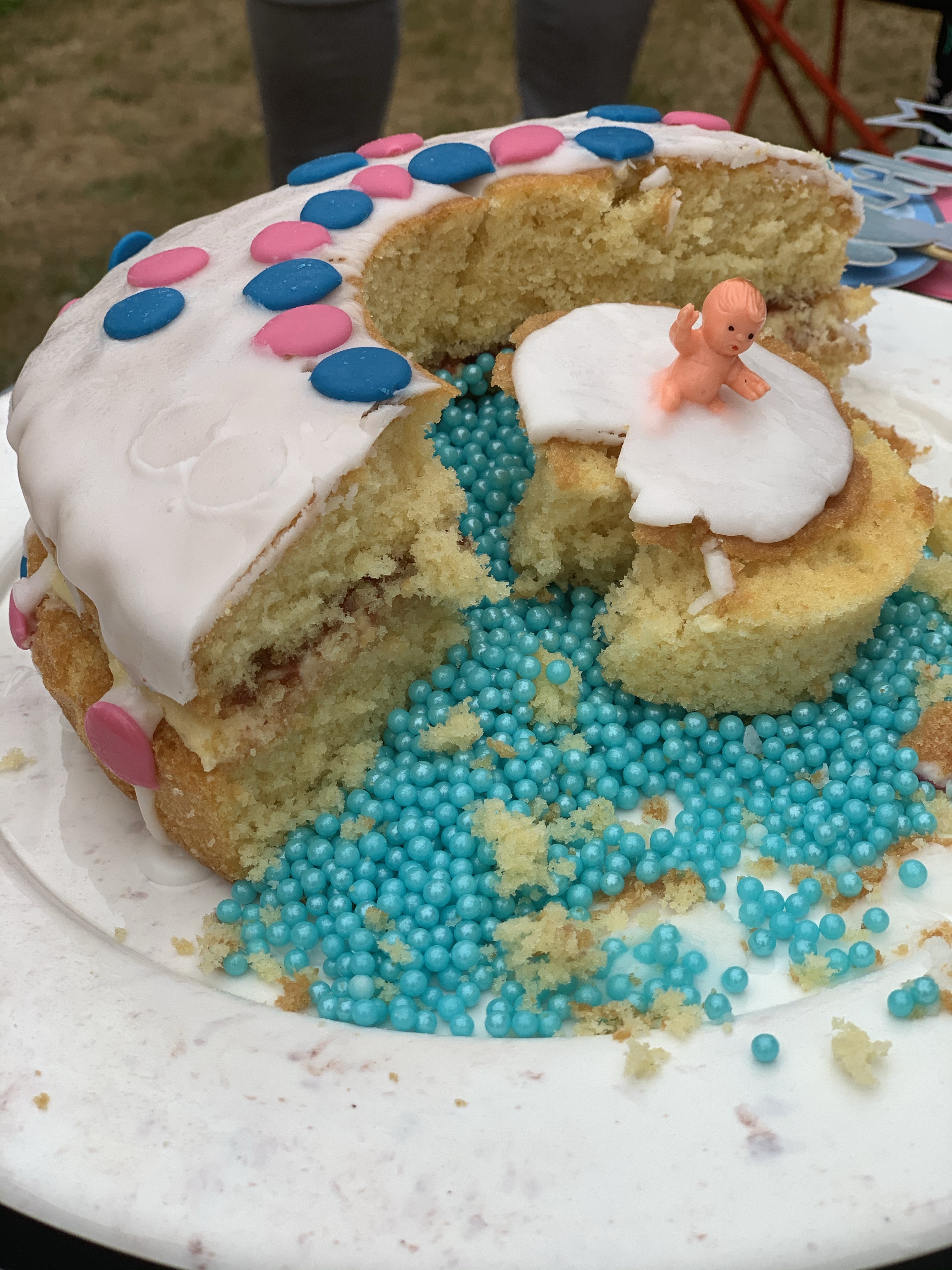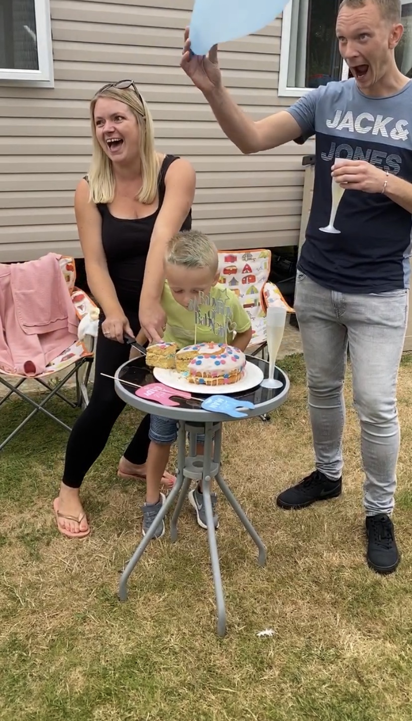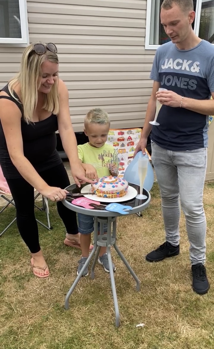 The rest of the Famo arrived and the excitement began. Em had had a scan that morning and she and Chris now knew the gender of their new baby. A cake had been made by Great Nana and the centre filled on the day by Em with the appropriate colour mini-balls. It was Teddy’s role to cut the cake to find out if he will have a little brother or a little sister in January.