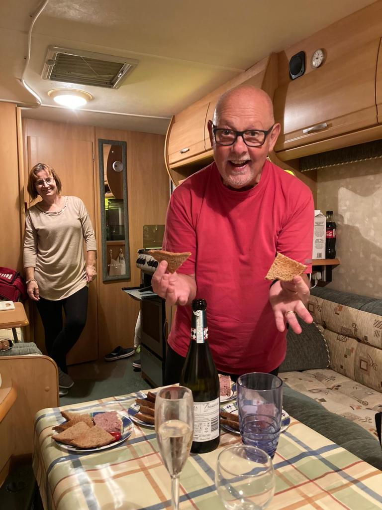 This evening it is JW and Elaine’s turn to supply dinner in the caravan – fabulous pasta-bake cooked by Elaine; I’m sure my brother helped with some part of the evening.🧐 Obviously a jolly time was had!!