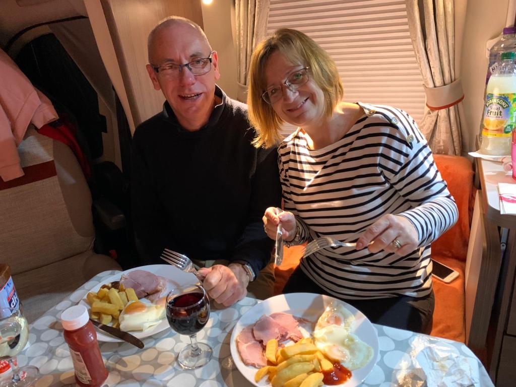 Our turn to cook dinner in the motorhome …….. what’s for tea?! JW’s favourite …….. Ham, Egg & Chips, with wine of course!!