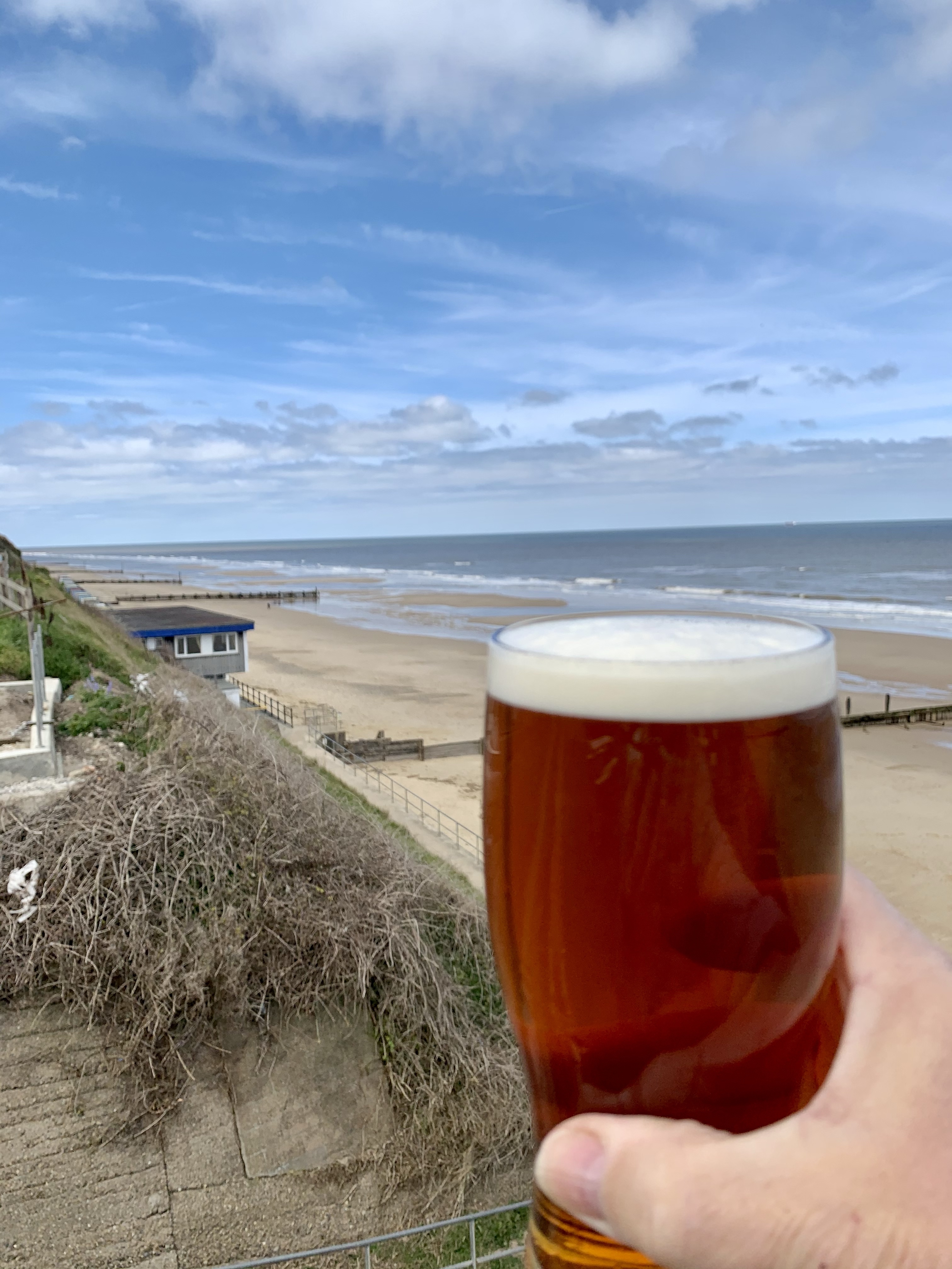 Later, we walked up Incleborough Hill directly from the site – lovely views across to Cromer and Sheringham with the (now 3) wind farms in the distance out at sea. As we returned to the site, time for a beer outside the The Hole in One Sports Bar & Grill at the golf club https://theholein1.co.uk/. First beer since Lockdown 3.0 (except, of course, for the one he had in Mundesley earlier!!)
