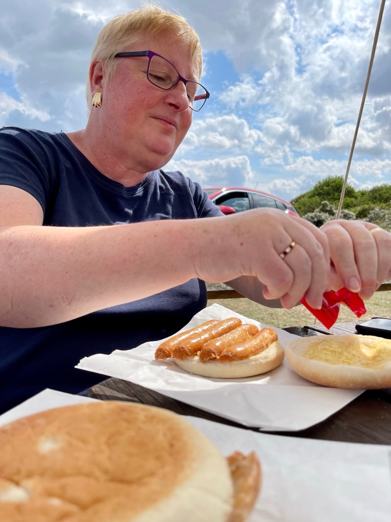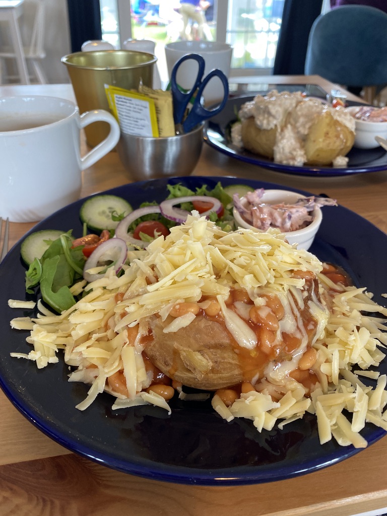 Rain overnight and a grey day so we set off in the car to a beach café that I’d found which had great reviews. We were not disappointed. The Anderby Beach Café https://www.anderbybeachcafe.co.uk provided a superb jacket potato lunch in a beach-themed wooden building. In the garden were tables inside pretty beach huts which you could book for your special event. Lovely staff and the icing on the cake was a pair of scissors in the condiments’ pot so that you could cut your ketchup / mustard / mayo packet instead of fighting with the packaging – how sensible – yay!