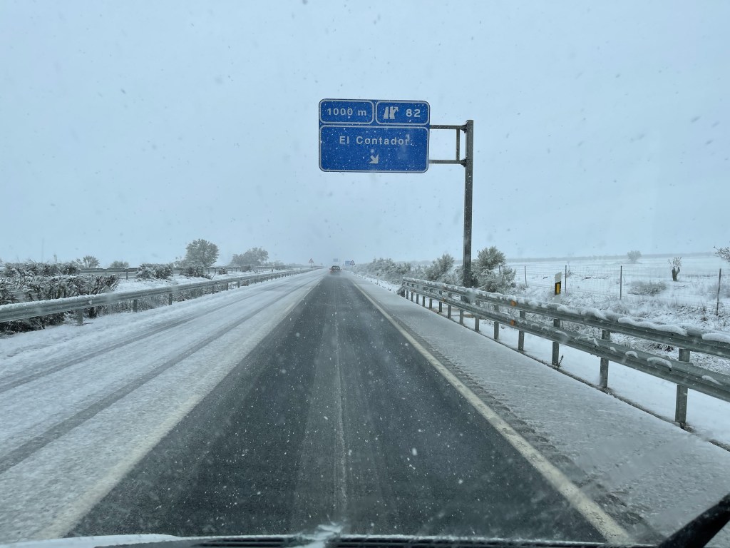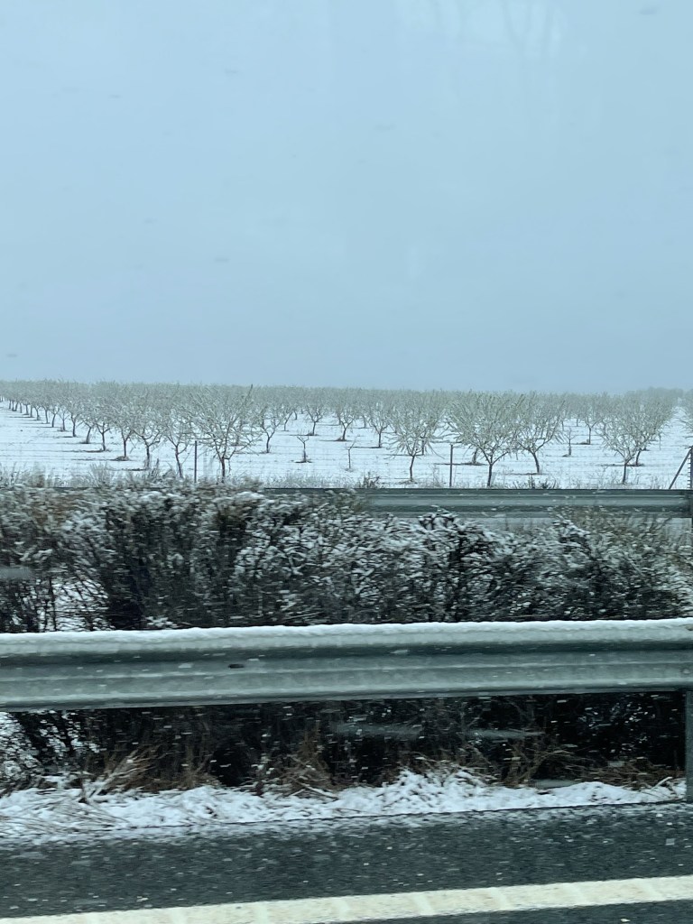 Soon after that the road began to climb and climb, the rain turned to hail, then to sleet and finally to …….. snow!! The orange groves on either side were covered by a white layer, well those we could see through the blizzard conditions! For a short time, only one lane of the road was navigable in either direction, two tyre tracks wide. No really, we came away for some winter sun!!