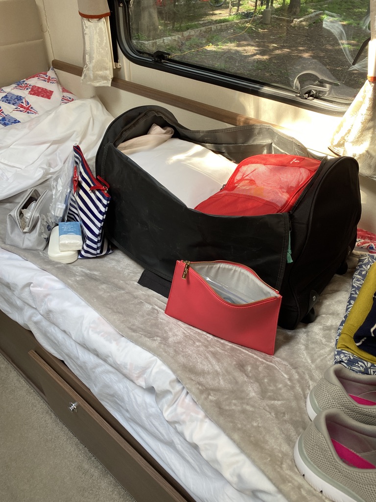 So, my new £14 duffle on two wheels is ready. Packing at home for a long motorhome holiday whilst also packing for a city break in a 4 star hotel, plus glamorous nights out with the Tea Girls has been a challenge. Let’s hope I’ve got everything!