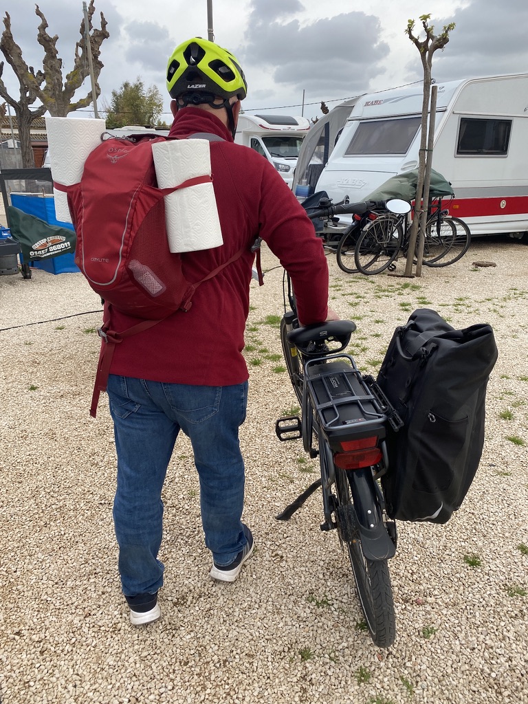 In the afternoon, Husband set off on a shopping mission. Normally we both go so have three pannier bags and two rucksacks. Husband only has one pannier bag and one rucksack so had to make some adjustments to get the shopping home – kitchen roll power packs!