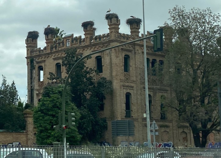 Husband and I departed Seville by taxi back to the site, leaving the Tea Girls to travel to the airport soon afterwards. On the journey …. a large, grand but abandoned building with storks nesting in all the chimneys.