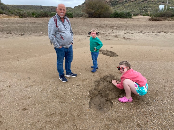 At the last minute we have arranged to meet with my nephew and his family in San Juan De Los Torres where they are staying at Lucy’s parents’ holiday apartment. We have found a wild camping zone on the edge of the town quite near to them; we’ve never done this before. On arrival its a large, attractive area on the dunes, above the sea and with a castle on the skyline. There are quite a few other motorhomes there and, surprising to me, several very expensive ones!