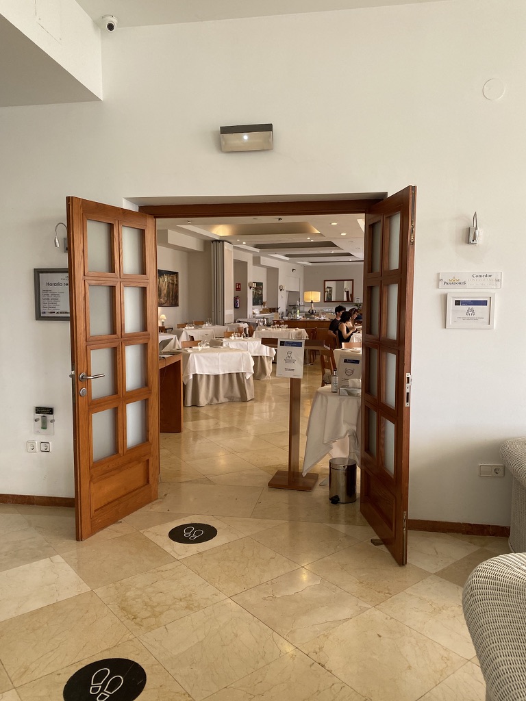 The Parador is in a lovely position above the beach. The terrace was very busy with people having drinks so we decided to sit inside to have coffee, open our cards and raise a glass of Cava at the appointed time.