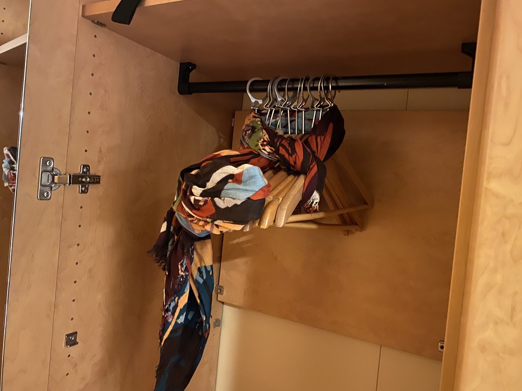 Having emptied the wardrobe I then had to tie up the coathangers with a scarf to stop them swinging/clattering with the (slight) motion of the ship during the night!