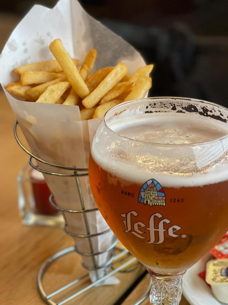 Returning to Brasserie Tompouce place later, we had some Belgian frites with mayonnaise; Husband had a big Leffe Blonde beer while I had small Leffe Ruby beer.