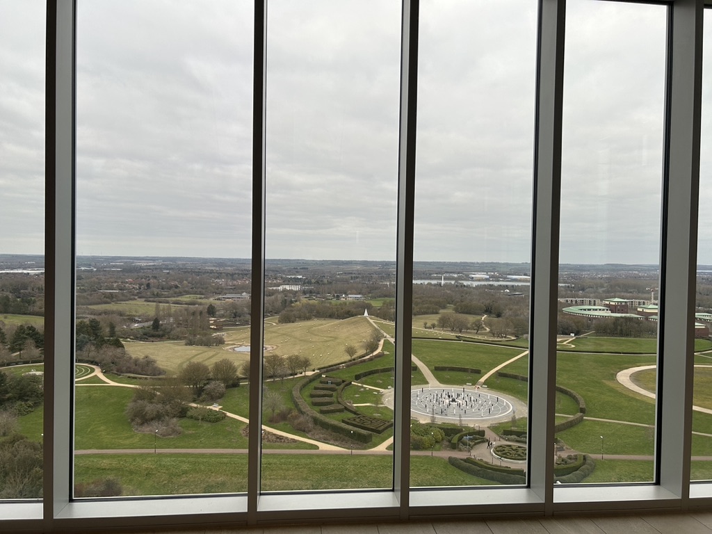 Free time to explore – Husband and I wandered over to Campbell Park. Looking back from The Milton Keynes Rose https://miltonkeynesrose.org.uk, an art installation ‘offering a place for celebration, commemoration and contemplation, an open-air circle with markings based on the mathematical beauty of a flower’, towards our hotel.